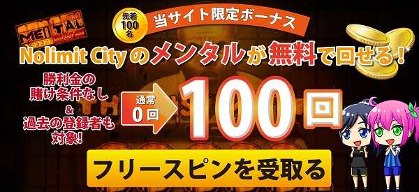 当サイトから登録した人限定でメンタルのフリースピンがもらえます!なんと、フリースピンで得た勝利金は条件無しですぐに出金できます!