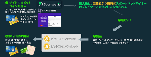 スポーツベットアイオーには、ビットフライヤーのような仮想通貨取引所の機能がありクレジットカードやアップルペイ、グーグルペイのアカウントさえ持っていれば、スポーツベットアイオー内でビットコインや他の仮想通貨を買うことができるのです。