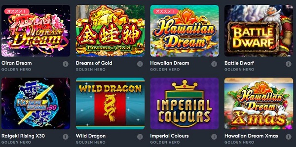 | プロバイダ | Evolution、OneTouch、Microgaming、Yggdrasil、Red Tiger、Golden Hero、NetEnt、Pragmatic Play、Quickspin、BetGames.TV、Play’n Go、Asia Gaming、Gameart、Booongo、Blueprint、eBet、Tom Horn、Ezugi、Booming Games、Caleta、Indi Slots、Thunderkick、Betsoft、Super Spade Games、Kalamba Games、Habanero、Push Gamingなど、他多数 |