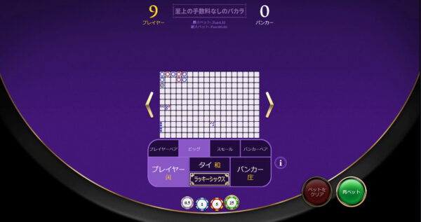 上の画像はオーソドックスなバカラです。テーブルレイアウトがシンプルですっきりしています。