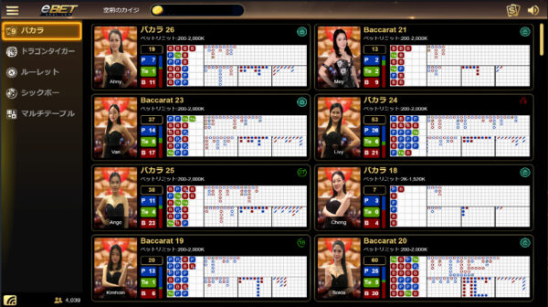 eBetのライブバカラは、ドラゴンタイガーも取り扱っていますが、オーソドックスなバカラが中心です。