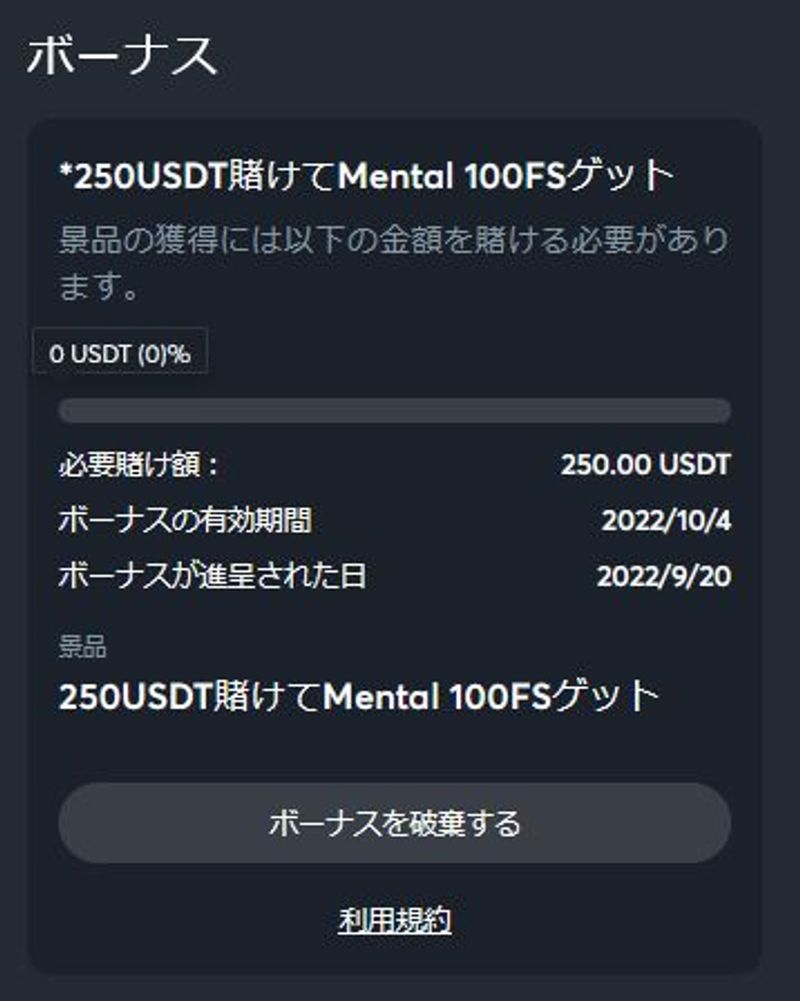先程のボーナスのページに移動します。250USDT以上賭けていれば、上記のパーセンテージが100になるので、そのままフリースピンを獲得することができます。
