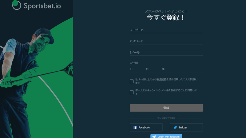 スポーツベットアイオーでは、Twitter、Facebook、LINE ID、Telegramでもアカウントを作れるのですが、ここではメールアドレスを使って作成する方法を紹介します。