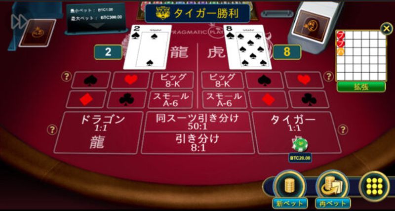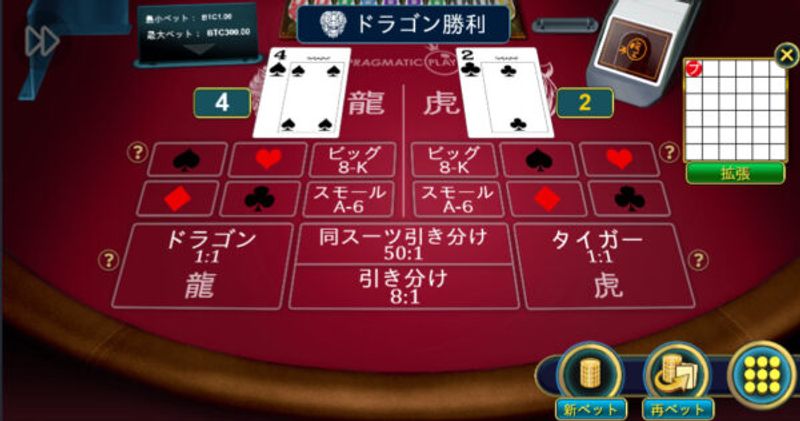 [jin-fusen2 text="PRAGMATIC PLAYの「Dragon Tiger」のプレイ画面"]