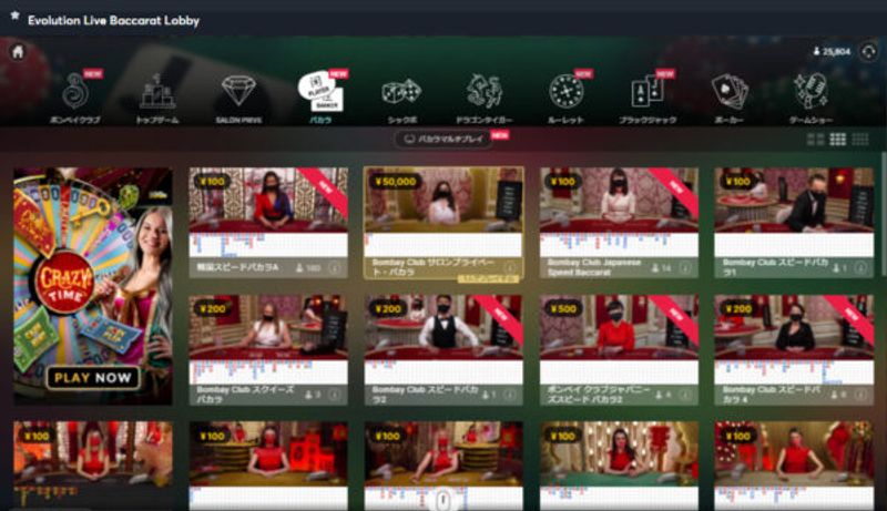 Evolutionは全プロバイダの中で最もテーブル数が多く、定番のバカラから変わったバカラまで幅広く揃っています。
