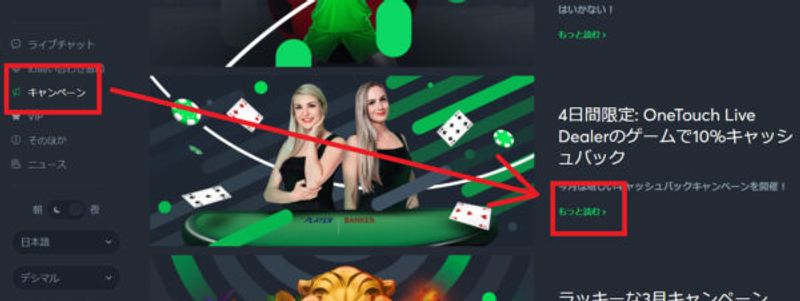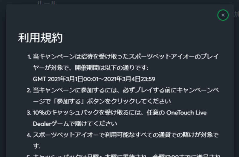 【過去の例】「4日間限定: OneTouch Live Dealerのゲームで10%キャッシュバック」の内容