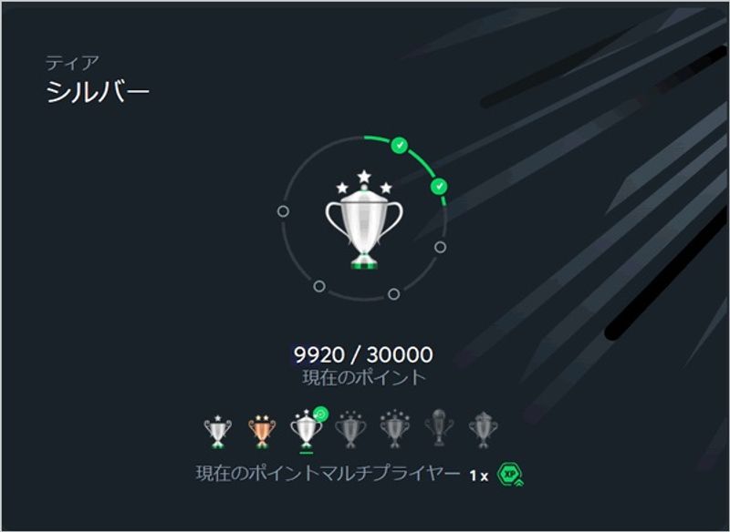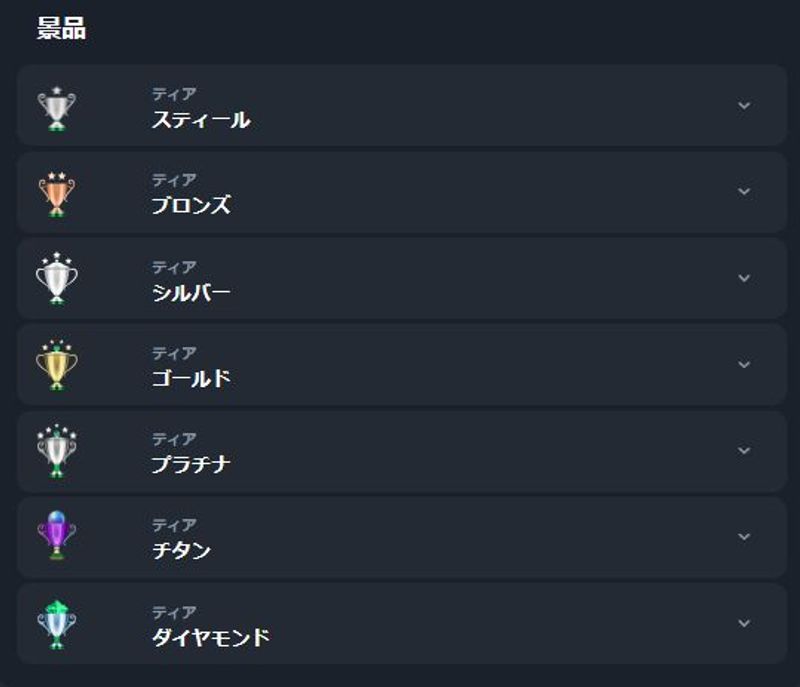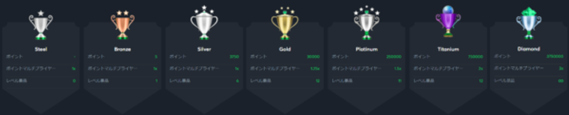 プレーに応じてブロンズ、シルバー、ゴールド、プラチナ、チタンと昇格し、最後がダイヤモンドとなります。トップそれぞれのレベルで、景品やマルチプライヤーが設定されています。