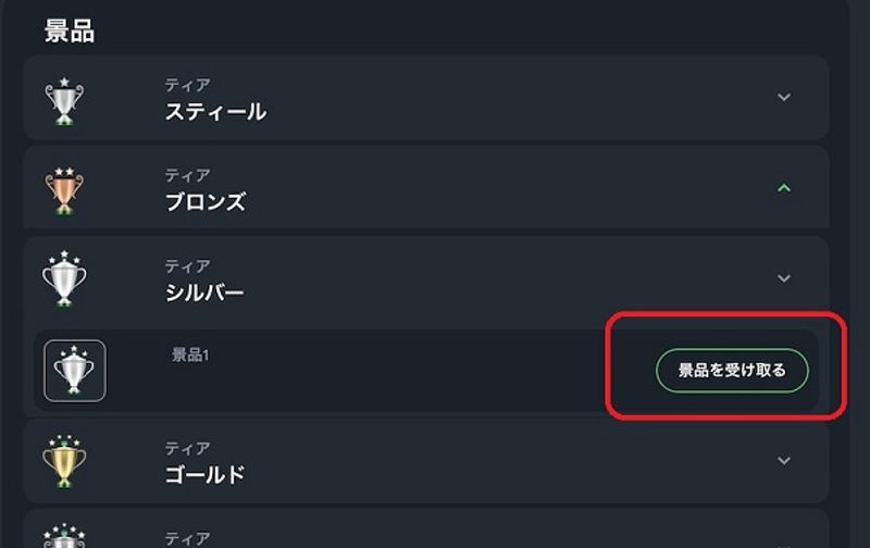 プログレスバーに「景品を受け取る」というボタンが表示されますのでクリックします。