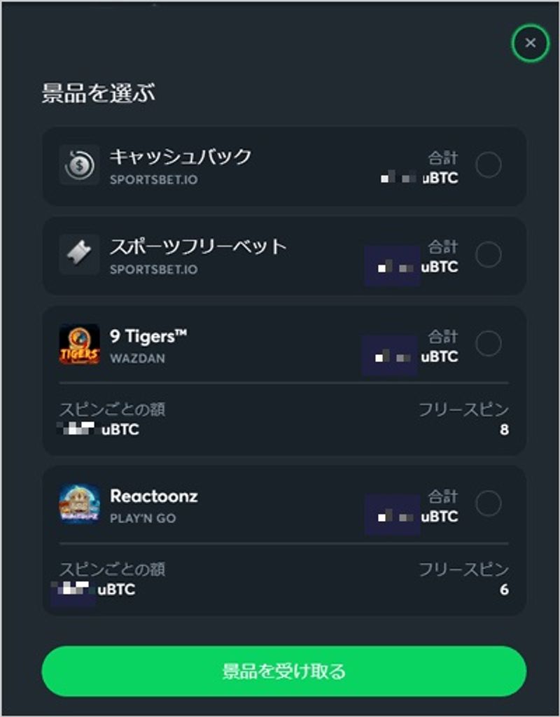 景品は仮想通貨ウォレットでの受け取りとなります。日本円メインで遊んでいる方は、ある程度貯まってきましたらアカウント管理画面で仮想通貨ウォレットに切り替えて、景品をお受け取りください。