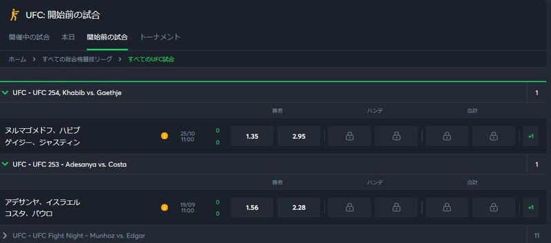 アメリカで開催されているUFCを選択しました。するとこんな感じでUFCの試合が表示されます。