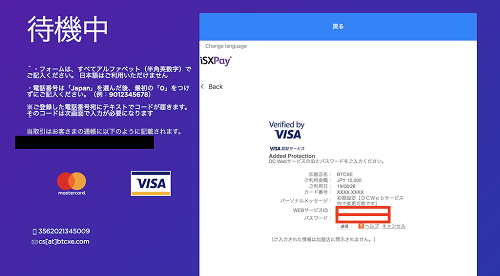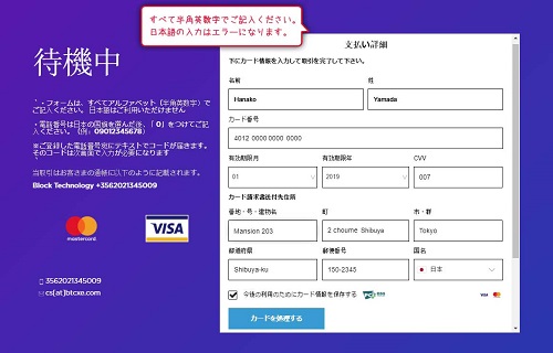 STEP3:「BTCXE」の画面に入りクレジットカードの情報を入力する