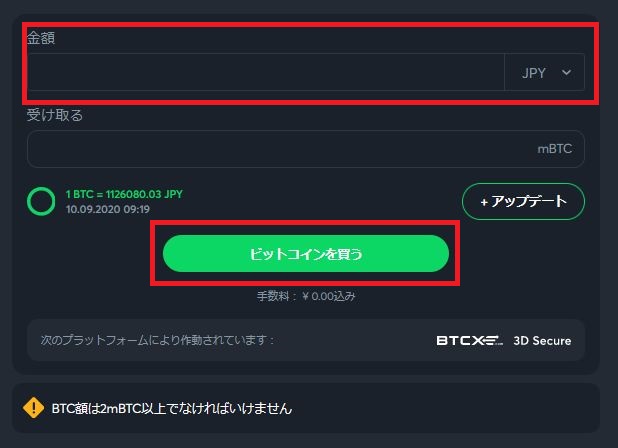 ビットコイン通貨を選択し(mBTCもしくはμɃ)、購入したい金額を半角英数字で記入後、「ビットコインを購入する」ボタンをクリックします。