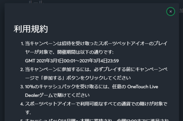 | 対象ゲーム | スポーツベットアイオーのすべてのカジノゲーム (ライブカジノ、ビデオスロット、テーブルゲーム) ※バーチャルスポーツは対象外 |