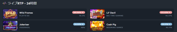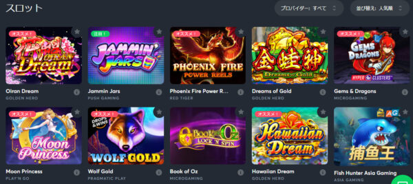 画面中央には「日本で人気のあるゲーム」「新しいゲーム」「ライブRTP(高い順)」「キャンペーン対象」「プロバイダ」など、好みで選べるように様々なカテゴリーが用意されています。