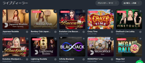 - ライブカジノのプロバイダ、おすすめゲーム