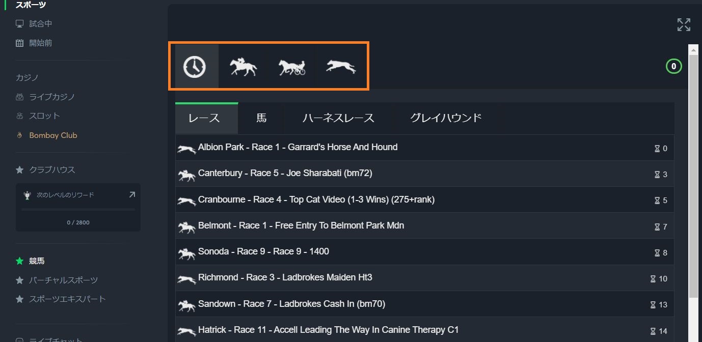 競馬をクリックすると、競馬のトップ画面が表示されます。右上のアイコンを押すと、全画面表示も可能です。競馬では、競馬、ハーネスレース(繋駕速歩競走)、グレイハウンド(ドッグレース)が賭けの対象となっており、トップページでは、これから開催されるレースが一覧で表示されます。