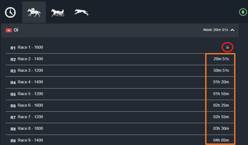 既にレースが終わったものは、1着から4着までの馬番が書いてあります。まもなく開始のレースは緑色の背景(直前になると赤)になっています。それ以外は、レース開始までの残り時間を示しています。
