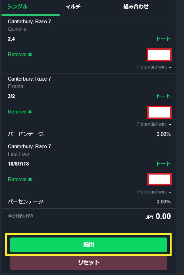 賭けたいオッズをクリックするとベット画面が開くので赤枠に賭け金を入力します。これで提出を押すとベットが完了します。