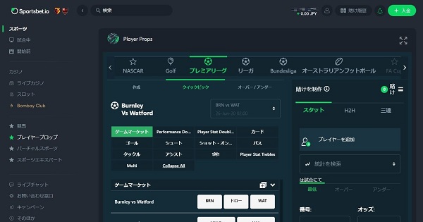 上記の画面に切り替わります。これはイングランド・プレミアリーグ、バーンリーvsワトフォードの試合を対象にしています。それでは、プレイヤープロップを作成してみましょう。