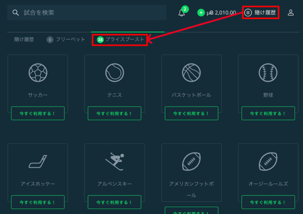 その場合、「賭け履歴」→「プライスブースト」で確認すると、使用済みのスポーツは「使用する」が暗くなっていて押すことができません。