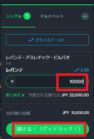 内容を確認後、下に表示されている「賭ける!(グッドラック!)」を押したら、ベット完了です。