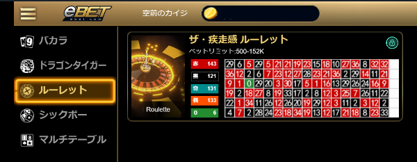 eBETのライブルーレットは、ディーラーのいない「ザ・疾走感ルーレット」の1つのみです。