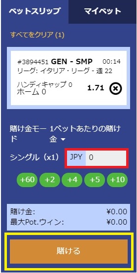 それでは、ジェノアvsサンプドリアの「ジェノバ・ダービー」で、ジェノアの勝ちに賭けてみましょう。ジェノアをクリックすると、画面右側にベット画面が表示されます。