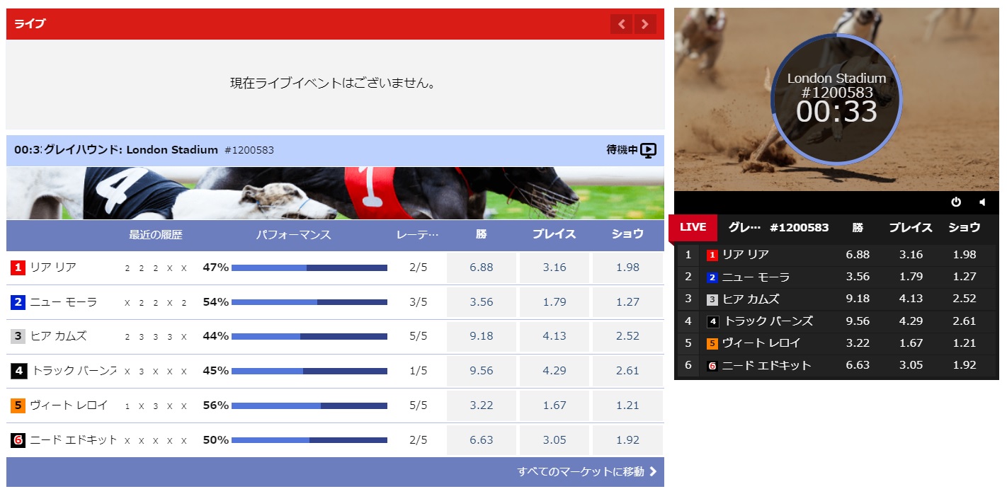 モーターバイクについても、賭け方はグレイハウンドや競馬と同様です。各レースに6人がエントリーしており、1位になりそうな選手を選びます。過去の戦績は1位~3位と4位以下で過去5戦まで表示されており、パフォーマンスも表示されますので、これらの情報を参考に賭けてみましょう。