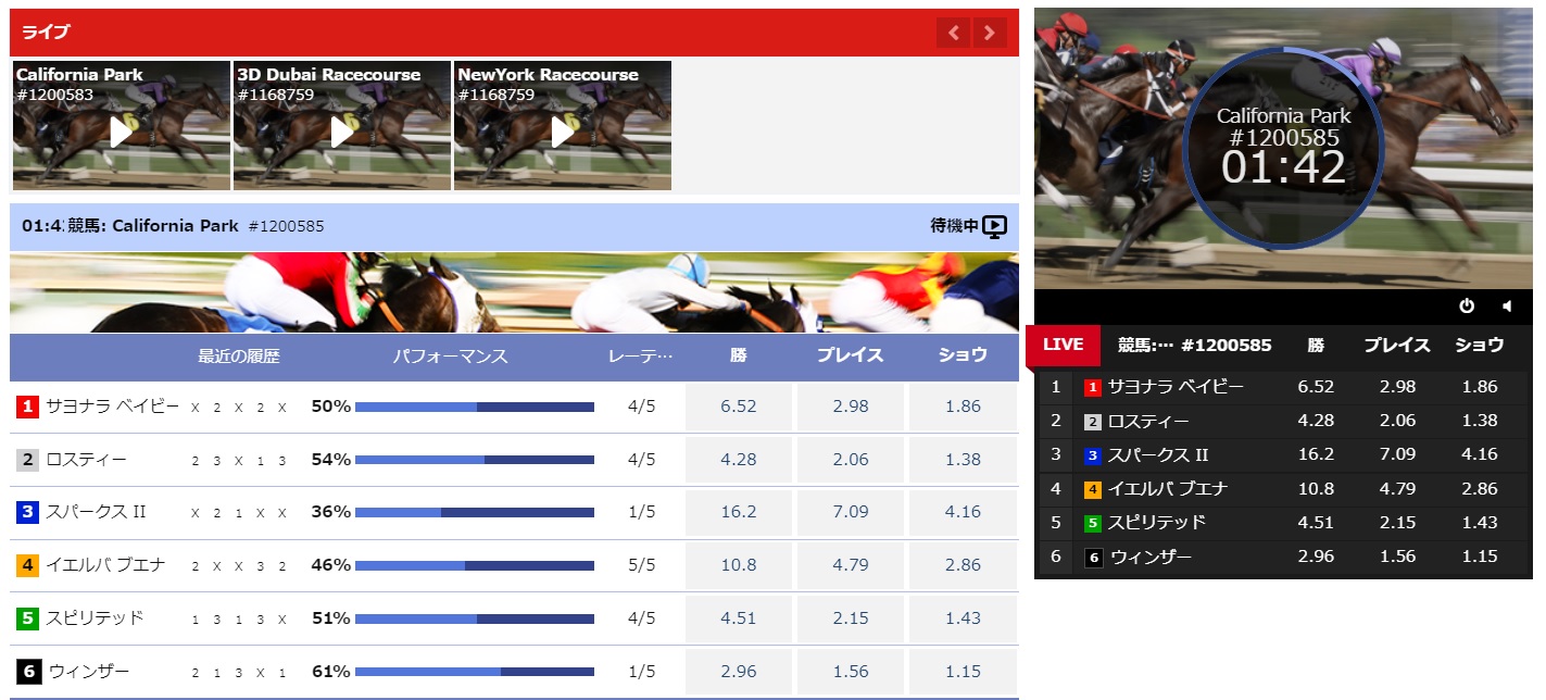 競馬についても、賭け方はグレイハウンドと同様です。各レースに6頭が出頭しており、1位になりそうな馬を選びます。過去の戦績は1位~3位と4位以下で過去5戦まで表示されており、パフォーマンスも表示されますので、これらの情報を参考に賭けてみましょう。