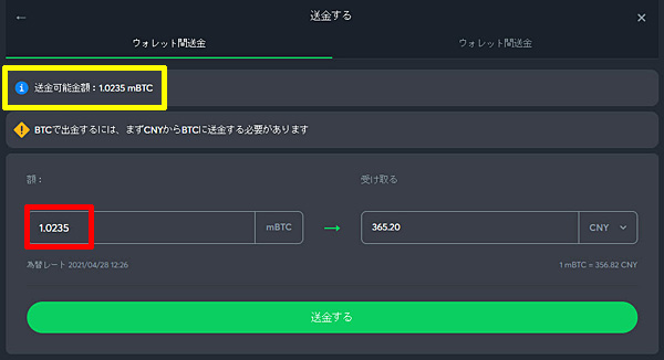 最低送金額は1mBTCです。「送金する」をクリックすると完了です。