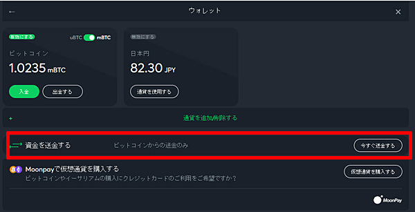 ウォレット画面が表示されます。ビットコインを日本円へ換金する場合には赤枠の「資金を送金する」をクリックします。